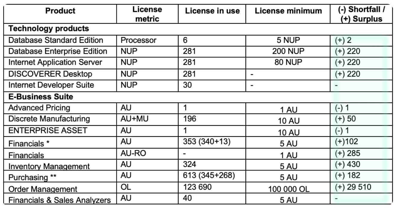 - Usage assessment — Evaluated OEBS usage in alignment with Oracle LMS methodology and identified potential non-compliance