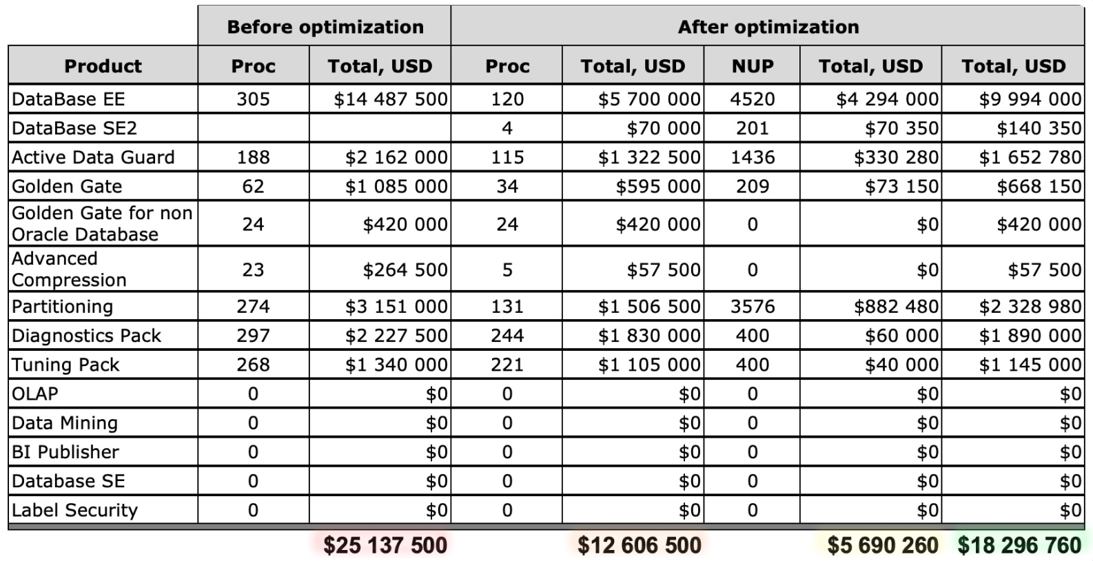 - Reduced declared Oracle license cost from USD 25 million to USD 18 million (per Oracle’s list price)