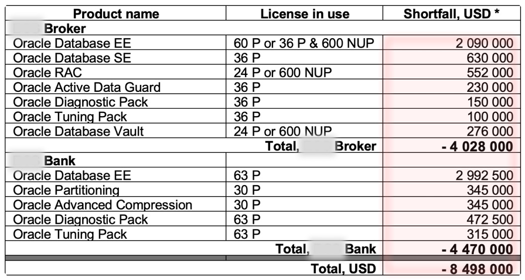 - Cut declared Oracle licensing from USD 8.5 million to about USD 750,000 (per Oracle price list)